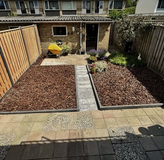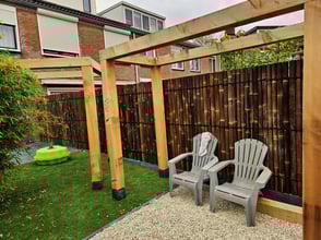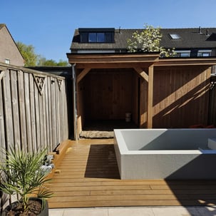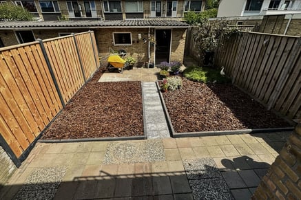 Een compleet nieuw ontworpen onderhoudsvriendelijke oplossing. Een nieuw terras, schutting en overkapping maken deze tuin de ideale plek om te relaxen.