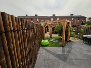 Een prachtige bamboohouten schutting maakt een warme uitstraling voor deze tuin
